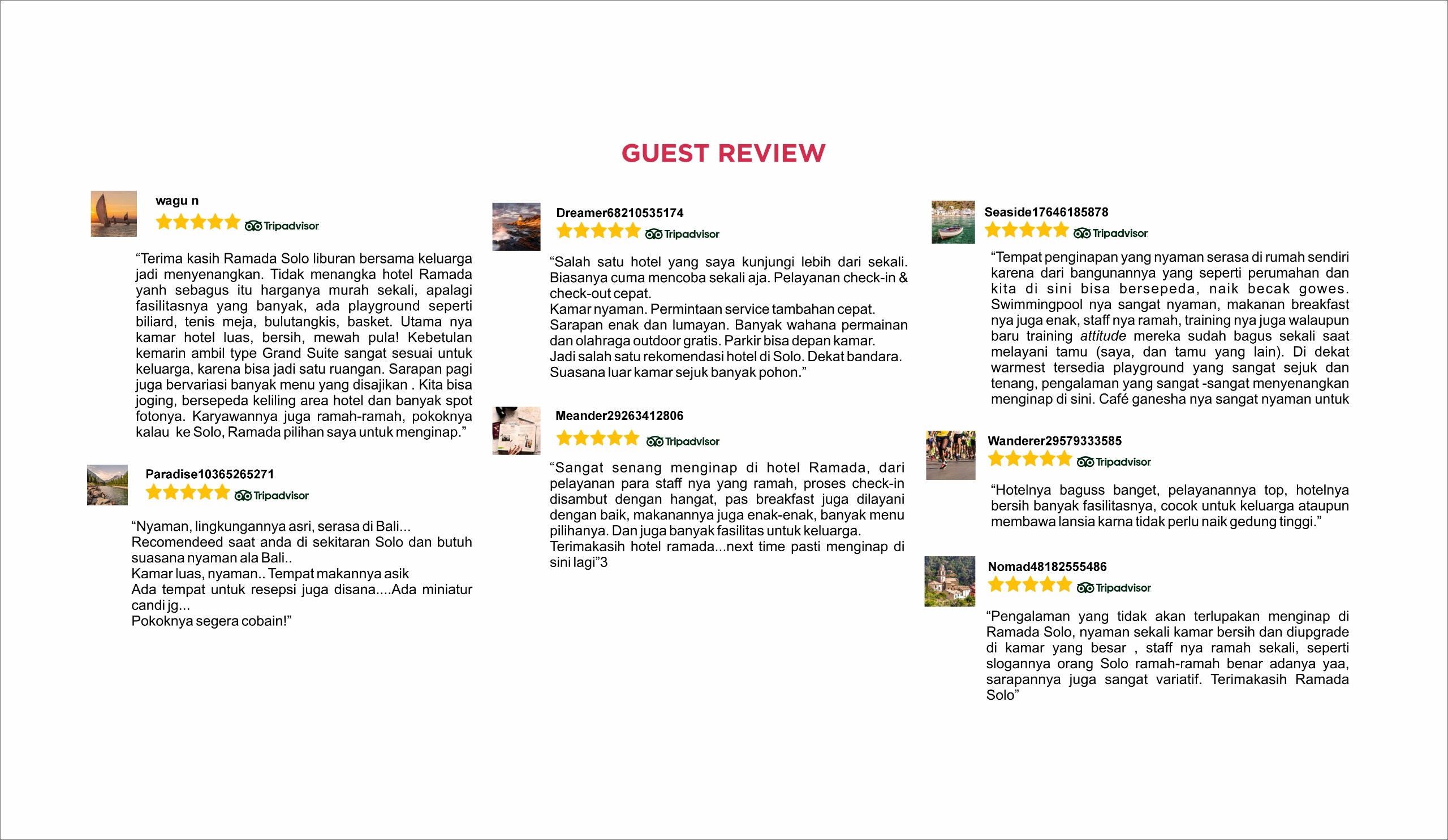 Berjumlah 160 kamar dengan 8 tipe kamar yang berbeda, membuat segala segment cocok untuk menginap di hotel Ramada Suites by Wyndham Solo. Dengan luas bangunan yang mencapai 2.5 hektar, para tamu dapat beraktivitas lebih banyak, seru, dan menyenangkan saat menginap bersama kami.